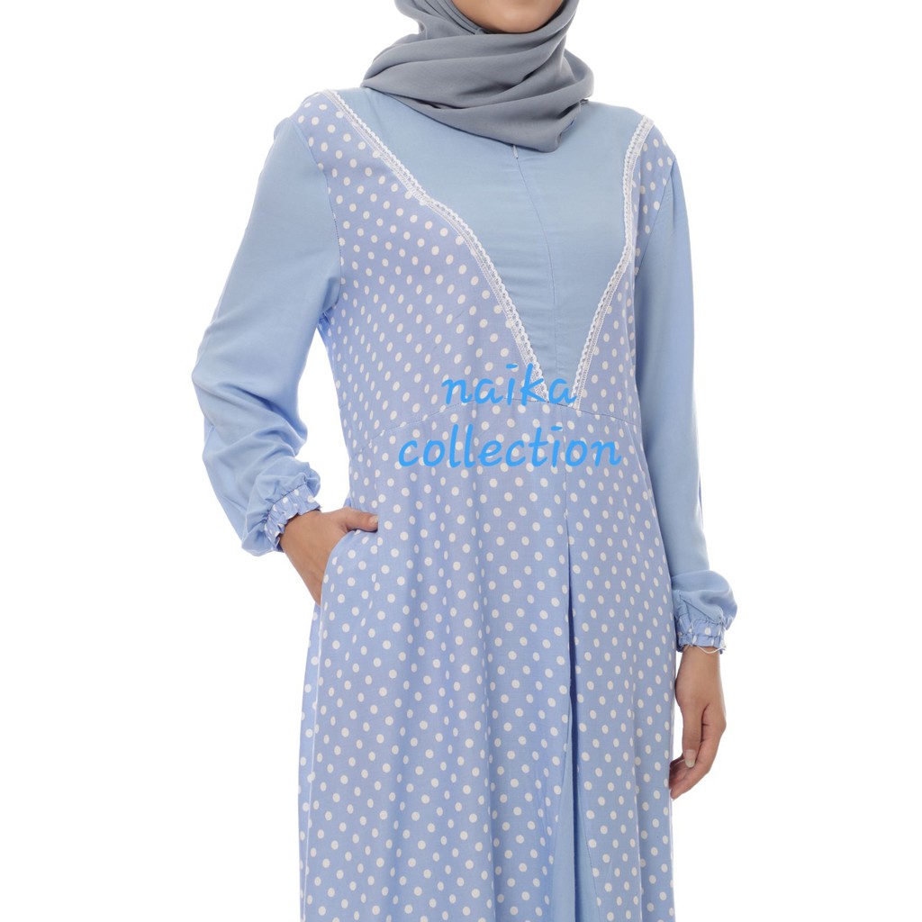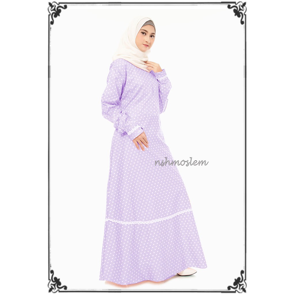 Katun polkadot kombinasi renda cantik sleting belakang ujung tangan karet jilbab tanpa pad bahan baloteli. Baik di toko butik mall sampai department store.